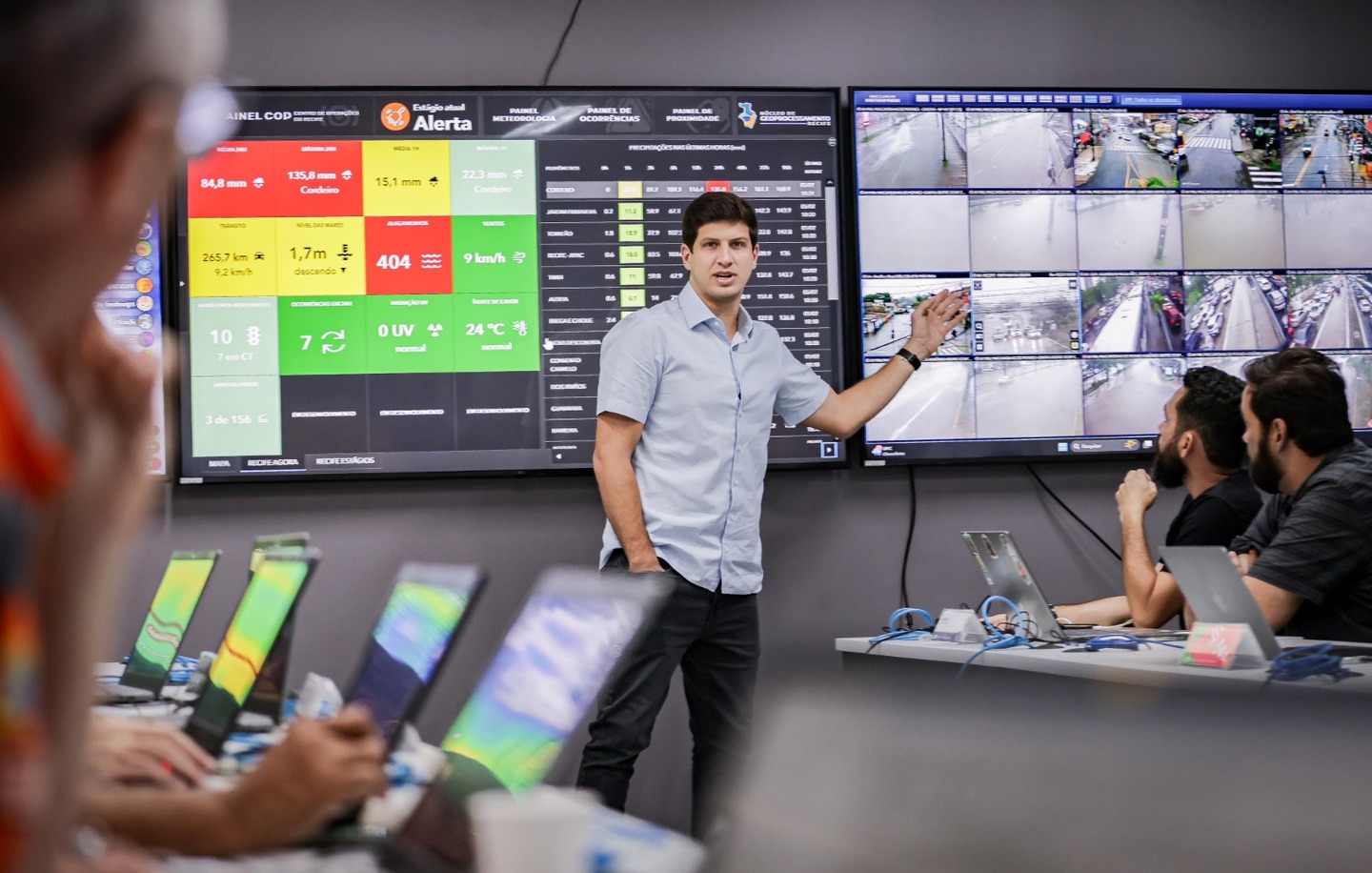 O prefeito João Campos comandou, na manhã desta quarta-feira (5), uma reunião na sala de monitoramento do Centro de Operações do Recife (COP) para coordenar as ações emergenciais diante do agravamento das chuvas na capital. A cidade se encontra em estágio de alerta máximo – quando condições meteorológicas extremas representam risco máximo à população e exigem a formação de uma ampla força-tarefa para o restabelecimento da normalidade – desde às 10h20. A orientação da Prefeitura é que a população evite deslocamento.