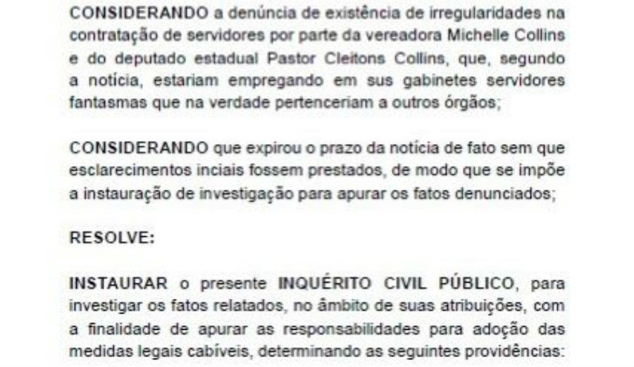 A promotora de Justiça Andrea Fernandes Padilha Nunes instaurou inquérito civil público para investigar denúncias de irregularidades na contratação de servidores nos gabinetes da vereadora Michele Collins (PP) e do deputado estadual Pastor Cleiton Collins (PP).
