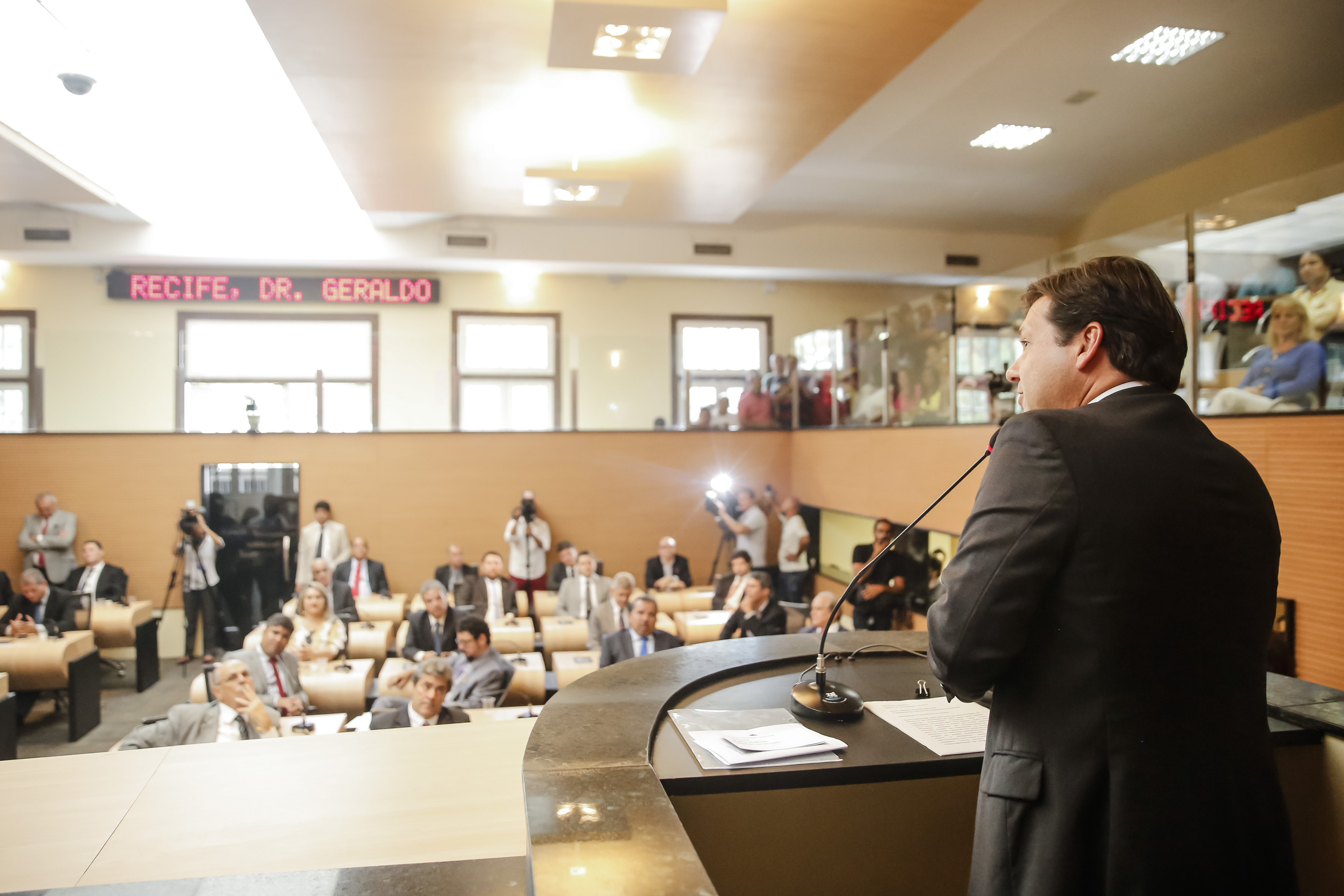 Com pouco mais de uma hora de atraso e recebido entre palmas e algumas vaias, o prefeito do Recife, Geraldo Julio, participou da abertura dos trabalhos legislativos na Câmara de Vereadores, nesta quarta-feira (1º). O gestor leu a mensagem do Executivo, apontando as realizações, projetos e obras do Recife nos últimos quatro anos.