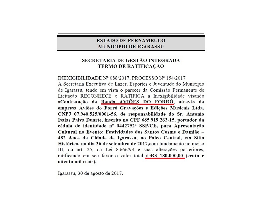 Apesar de a Prefeitura estar anunciando desde o início de setembro a festa, a contratação da banda Aviões do Forró só foi publicada no Diário Oficial de 22 de setembro, apesar do ato de inexigibilidade estar datado de 30 de agosto.