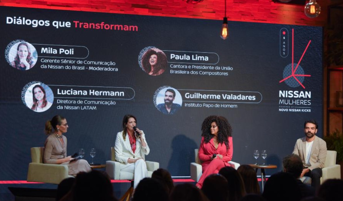 O painel “Diálogos que Transformam” contou com nomes como Luciana Herrmann (Nissan América Latina), a cantora Paula Lima, Guilherme Valadares (Instituto Papo de Homem) e Mila Poli (Nissan Brasil).