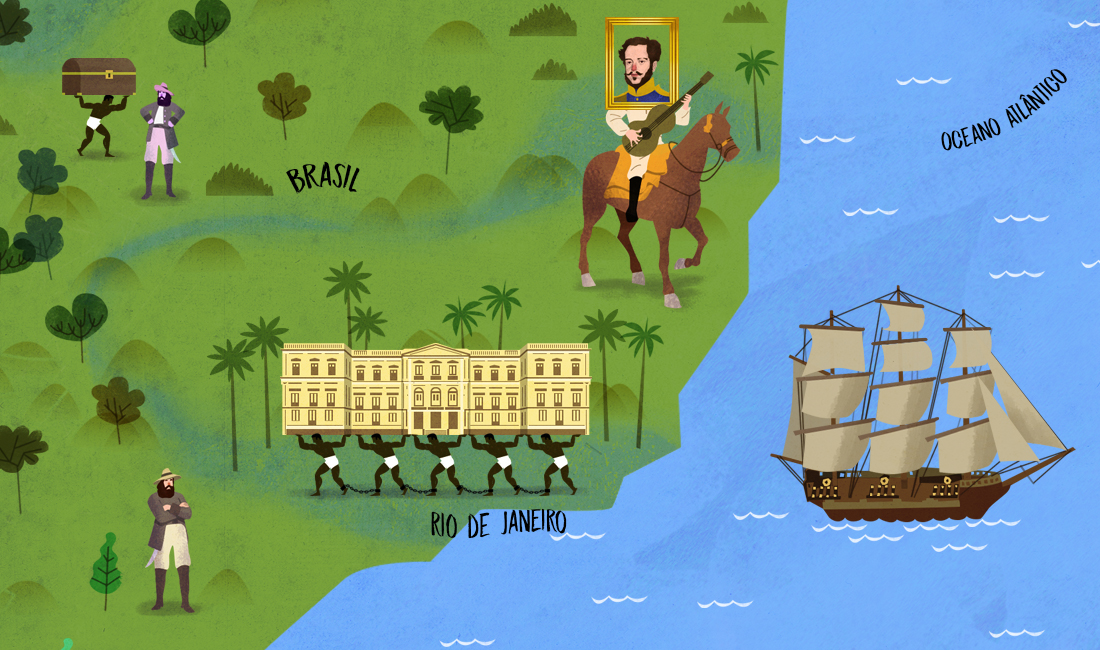 A viagem da família real portuguesa ao Brasil não foi agradável. Por 64 dias as embarcações sofreram com a inconstância dos ventos. Uma epidemia de piolho obrigou muita gente a raspar a cabeça. A água era cuidadosamente armazenada em pipas e fiscalizada, durante a viagem, pelo “fiel da aguada” - um título que ainda existe, hoje, na Marinha do Brasil. Mas essa água, no fim da viagem, era já pouca e ruim. O cozinheiro de bordo preparava as refeições com ingredientes que pudessem resistir à longa travessia - carne seca salgada, chouriço, galinha, paio, peixe em salmoura, porco, presunto, toucinho. Como tempero alho, alecrim, cebola, pimenta, sal, azeite e vinagre. Mais ameixas em conserva, azeitonas, biscoitos, cereais, confeitos, fartéis, marmelo, mel, queijo do Alentejo e vinho. Finalmente, em 8 de março de 1808, chegaram ao Rio de Janeiro. A cidade era suja, malcheirosa e descuidada. “Que horror. Antes Luanda, Moçambique ou Timor”, disse a princesa Carlota Joaquina. Ficaram a princípio no Paço do Vice-Rei. E, depois, na Quinta da Boa Vista - ofertada por Elias Antonio Lopes, um rico traficante de escravos. Para alojar os outros viajantes, cerca de duas mil casas foram requisitadas e seus moradores desalojados. Sobre as portas eram então marcadas as letras P.R. (de Príncipe Regente), que a irreverência carioca logo traduziu para “propriedade roubada”.
