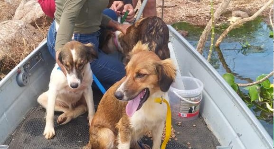 Três cachorros ficaram ilhados no Açude Castanhão, localizado no município de Jaguaribara, no Ceará. Os animais precisaram de resgate do Corpo de Bombeiros, que foi feito com uma lancha. O resgate foi feito na quinta-feira (4).