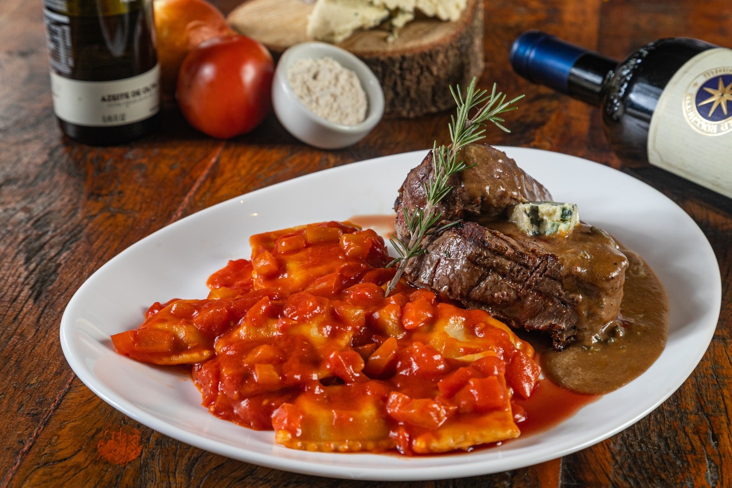 Salada – Mix de folhas verdes com alecrim e manjericão, finalizado com azeite com ervas de provence e balsâmico de maçã Vom Fass, harmonizado com Baden Cristal