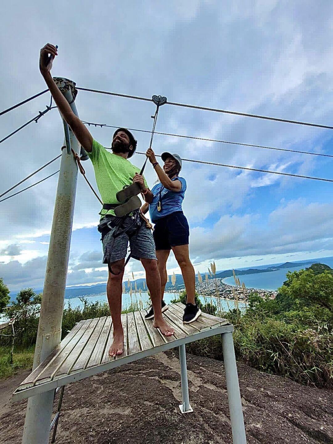 Gosta de aventura? Então se liga nessa dica: tirolesa em Bombinhas. É a Jumpline Tirolesa. Para se jogar nessa aventura, o peso máximo permitido é de 100kg e mínimo de 25kg. A tirolesa tem 240m de altura e 170m de extensão. Vai a uma velocidade de 60km/h. Liga o ponto mais alto do Mirante Eco 360 ao morro em frente. Dura em média 20 segundos de muita adrenalina. Funciona de janeiro a março todos os dias e de abril a dezembro todo final de semana. Só não funciona em junho quando a turma da tirolesa fica de férias. Horário: 9h às 18h (alta temporada – jan a mar). Preço Mirante Eco 360: R$ 15 e Tirolesa R$ 55.