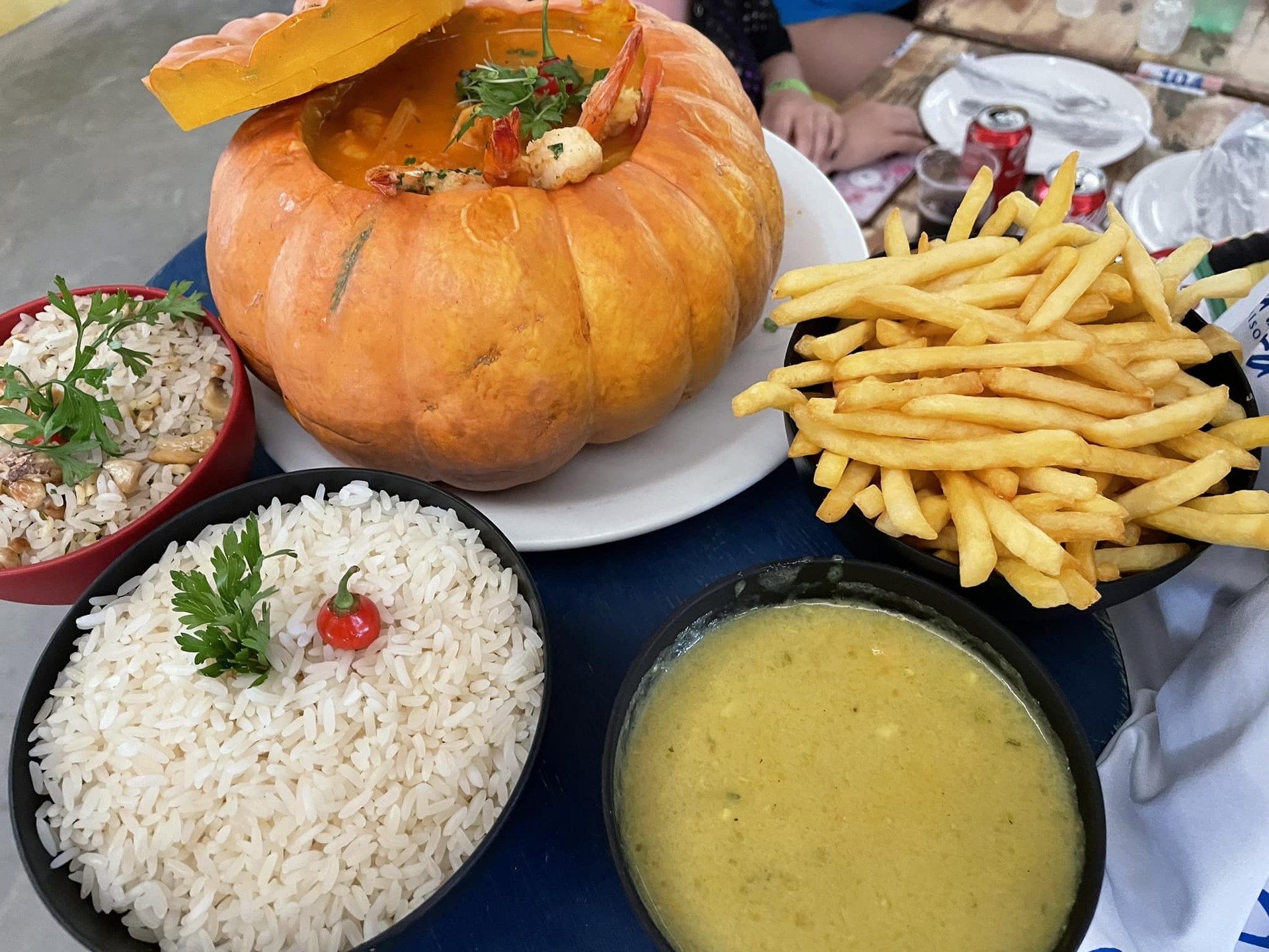 O cardápio do restaurante é bem variado, entre os petiscos: agulha frita, bolinho de bacalhau, macaxeira frita, caldinho de polvo, filezinho com fritas, etc. Entre as opções de pratos para 2 pessoas, camarão bora bora (aos quatro queijos, no coco verde, acompanha arroz e frutas da época); arroz de polvo com camarão (ao creme); e o famoso peixe ao pescador (filé de peixe super crocante, acompanha pirão de peixe, arroz e macaxeira frita). É uma delícia e super bem servido para 02 pessoas. Outra opção que faz muito sucesso é o camarão na moranga (foto abaixo). E pra beber, coquetéis, cachaças, água de coco, caipirosca, etc. Na mesa, fica uma plaquinha de ocupado ou você pode também deixar uma peça de roupa guardando o espaço até voltar do catamarã. E quando for à praia pode deixar suas coisas na bolsa ou mochila junto à mesa que ninguém mexe não.