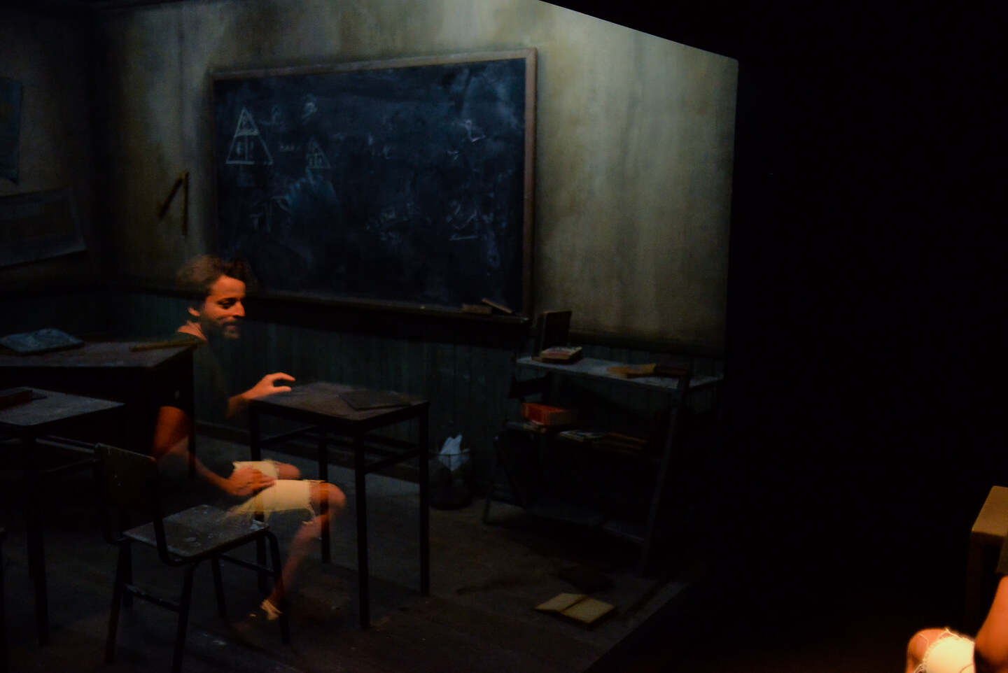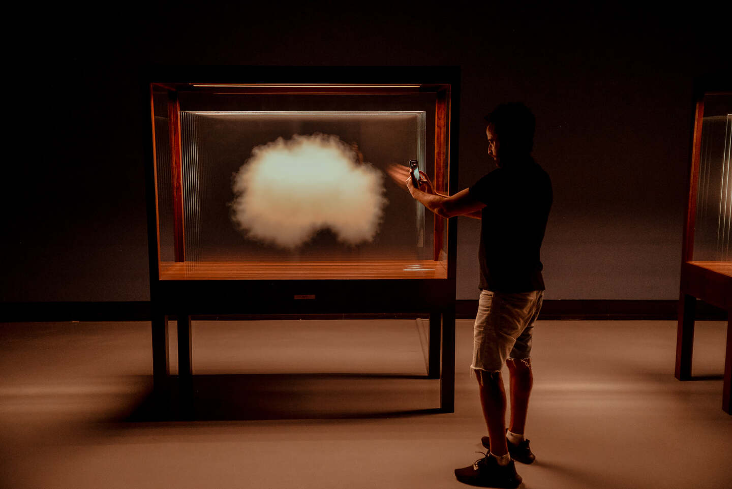 É uma sensação realmente única, primeiramente, ao olhar por cima da piscina pessoas caminhando dentro dela com os reflexos da água na superfície trazendo uma realidade visual indiscutível. Depois, estar dentro dela observando o mundo lá fora com os reflexos da luz sob a água. Além da piscina que é de fato o que mais chama atenção do público, vale a pena observar o elevador suspenso, onde ao colocar a cabeça pela janelinha da porta enxergamos um vão sem fim, reflexo dos espelhos colocados abaixo e acima do equipamento, além da espécie de nuvem presa num recipiente de vidro (foto abaixo). Tem ainda o jardim com seus reflexos que nos traz “estranheza” por conseguirmos nos ver em mais de uma janela ao mesmo tempo. E a sala com nossa versão “meio fantasma” é bem curiosa também: nos enxergamos numa sala de aula em que não estamos, mas aparecemos de forma sombria e translúcida. Super indico esta exposição por tudo que ela apresenta visualmente mas muito mais pelo que ela nos traz de sentimentos. Aí, você realmente precisa ir pra poder sentir!