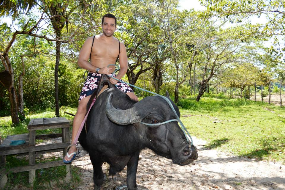 Na ilha de Soure, você pode fazer o famoso passeio de búfalo. Para chegar lá, pega-se um barco. Paga-se bem pouco pela travessia, algo em torno de R$ 2. Em Soure, é preciso pegar um táxi ou mototáxi para chegar à Fazenda Bom Jesus (passeio mais ecológico) ou à Fazenda São Gerônimo, famosa pela gravação do programa “No Limite”, e da novela “Amor eterno amor”. Nesta última fazenda, fizemos o passeio de búfalo, que custou R$ 50 e teve duração de três horas. O passeio inclui uma trilha, travessia de jangada e o “montar” no búfalo. Você combina com o taxista para lhe buscar no final do passeio, já deixe a hora marcada e não há problemas. Precisa reservar seu hotel? É só clicar aqui!