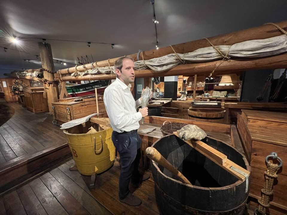 Começamos a visita conhecendo a embarcação que é gigantesca, inclusive podemos entrar e ver todos os espaços como funcionavam. Depois, passamos por exposição de objetos como iscas, cordas, além de outros tipos de barcos. Também observamos uma infinidade de conchas com a identificação de onde elas são. Cada uma mais linda que a outra! Aquário: e claro que no museu onde o Bacalhau é a grande estrela, não podia faltar o aquário com esses peixes não é mesmo? Em Portugal, ele é tão consumido no dia a dia que a população o trata como carne. Vale a pena conhecer as origens da história do bacalhau e o mais interessante é que muita gente pensa que ele é natural do mar português. Puro engano! O Bacalhau precisa de águas mais frias e por isso os pescadores de Portugal vão buscá-los na Noruega.