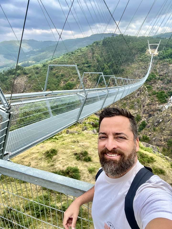 Prepare-se! Agora vem a programação com nível de adrenalina mais alto de toda essa trip. Cruzar a Ponte Arouca 516, que como o próprio nome diz tem 516 metros de comprimento. Quando construída, em 2021, era a ponte suspensa mais comprida do mundo. Hoje ela é a terceira, ficando atrás apenas de uma construída na República Tcheca e outra na Espanha.