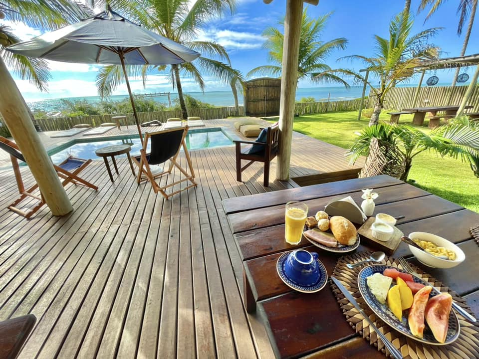 O café da manhã é servido junto ao jardim e à piscina, de onde se tem uma vista linda pro mar. Frutas, tapioca, ovos mexidos, bolos, pães, a mesa é bem gostosa pra começar o dia cheio de energia. O jardim conta com mesa grande onde é possível juntar amigos ou família pra jogar dominó, baralho, etc. É um ambiente bem familiar e pra quem quer realmente estar num momento relax em total harmonia com a vibe de Caraíva. Caminhando por lá pela praia, você encontra alguns restaurantes próximos onde é possível também fazer refeições.