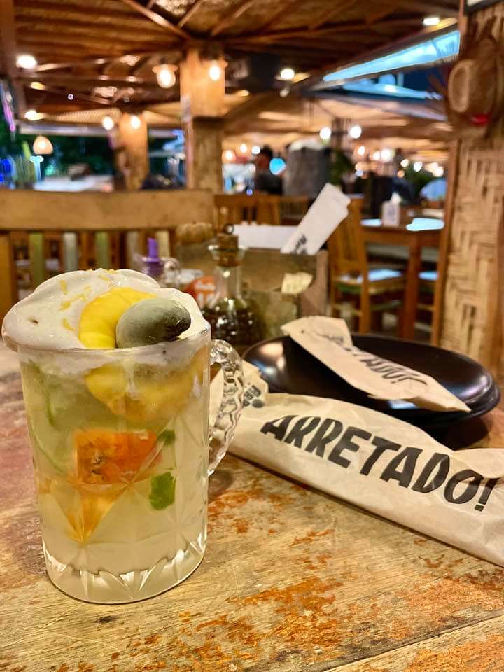 De sobremesa, cocada com tapioca R$ 32,90; compota de banana; sorvetes típicos e ainda picolés. Não se esqueça de provar os drinques da casa. São super bem elaborados. O barman manda ver muito bem! Tem sodas artesanais, soft drinks, destilados, cervejas e chopps, caipirinhas, etc. Provei uma caipi de caju e confesso que foi a melhor que tomei na minha vida! Tem um creme delicioso na cobertura do drinque que só depois eu descobri com o barman que era creme de banana. Uma de-lí-cia! Os drinques e pratos são super bem apresentados. O quiosque realmente é diferenciado e vale muito a pena conhecer. Tudo que provamos estava uma delícia, fresquinho, saboroso e a vontade era comer lá todo dia. Ah, o melhor de tudo: com preço mais que justo!