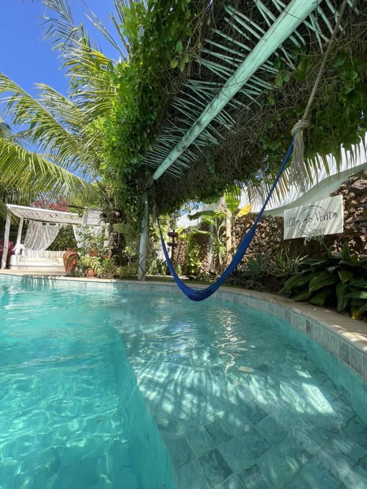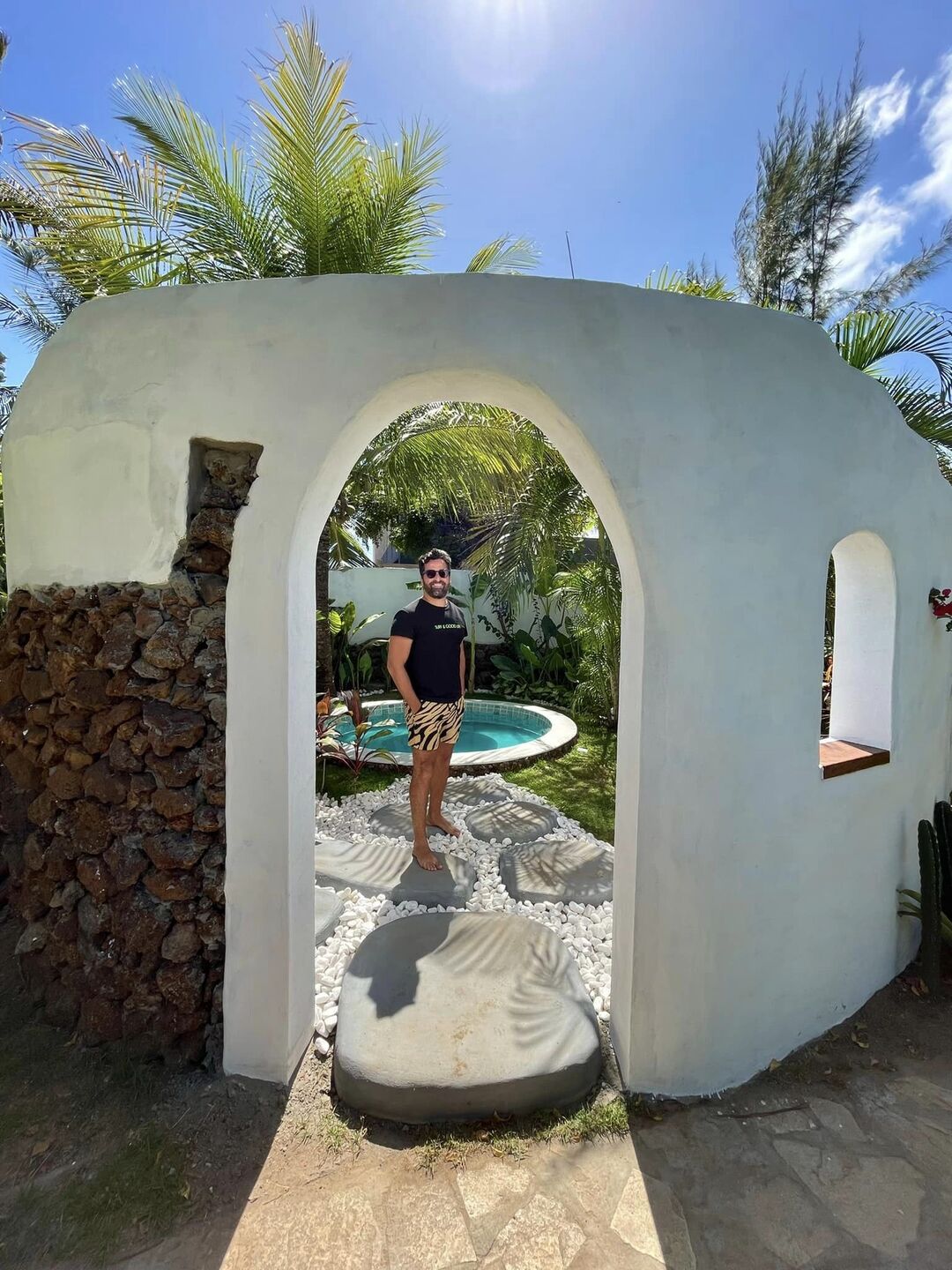 Conta com hidro aquecida, ótima pra relaxar final de tarde quando voltar da praia. Tem ainda piscina com rede e tenda no melhor estilo instagramável, amplo jardim e aceita pets. As acomodações são bem espaçosas e confortáveis. Possui doze quartos (categorias luxo, standard e master) que acomodam até 4 pessoas. Contam com frigobar e uma cama bem confortável, com vários travesseiros. Na foto abaixo, o jornalista Fabiano Antunes veste @Platz__.