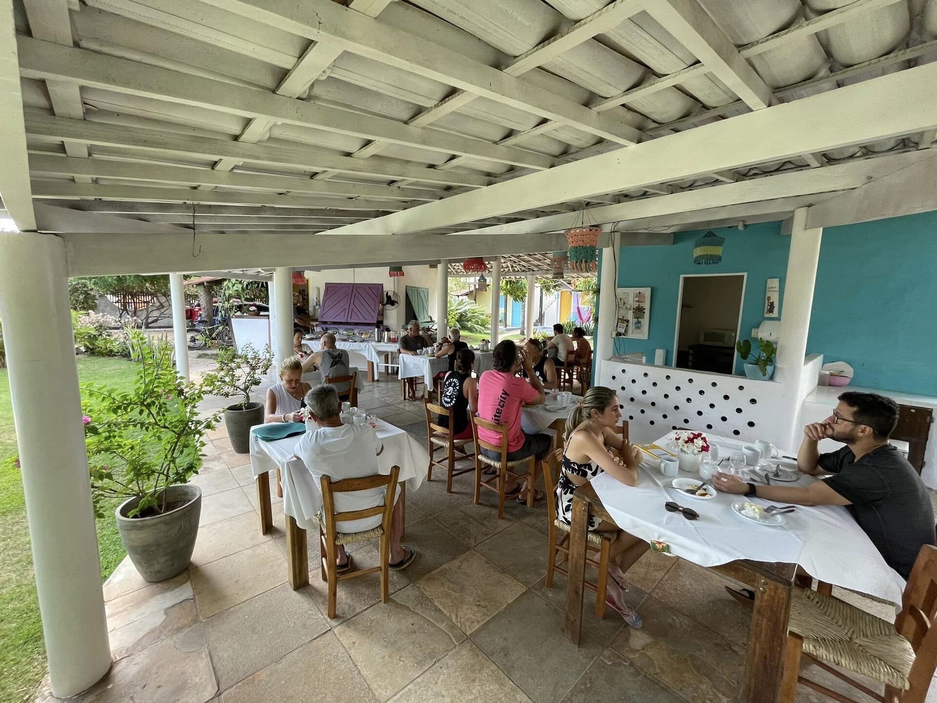 O café da manhã está alinhado com o charme da pousada: além dos tradicionais presunto, queijo, ovos e tal, tem ainda tapioca, bolos, tortas e uns quitutes bem diferentes e gostosos como panquecas e rabanadas. Pra beber, iogurte, leite e sucos. É servido das 8h às 10h. E ao longo do dia, tem sempre bolo e cafezinho pra o hóspede se servir à vontade. Quer um roteiro de 4 dias em Pipa? Clique AQUI e confira!