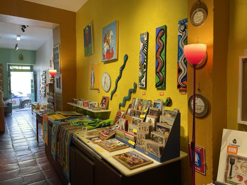 A casa onde funciona é estreita e logo na entrada você se depara com várias obras de artistas de Olinda, no melhor estilo ateliê. É lindo de ver e você também pode comprar pra dar de presente ou levar uma lembrança bacana da cidade partimônio histórico da humanidade. Tem quadros, peças em tecido, livros, canecas, objetos de decoração de casa, etc. Depois chegamos ao salão principal e mais ao fundo está o terraço com vista panorâmica da cidade do Recife. Uma delícia fazer uma refeição com um visual desses!