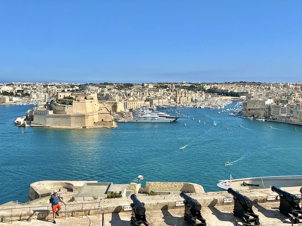 É de lá onde são disparados os tiros de canhão, tosos os dias, ao meio-dia e às 16h. Os tiros antigamente serviam pra saldar os navios visitantes. O acesso é gratuito, paga-se apenas pra descer ao espaço onde estão instalados os canhões. Não acho que valha a pena, até porque de cima a vista é mais bonita. Fica lotado, mas de onde estiver dá pra ver bem os disparos. De lá também saem ferry boats para as três cidades que vemos à frente do terraço. São as chamadas Three Cities: Vittoriosa, Senglea e Cospicua. O bilhete custa 2,50 euros | R$ 13,50 (trecho) ou 4,50 euros | R$ 21,60 (ida e volta). Se tiver o cartão de transporte ele também é válido para este trajeto. Para reservar hotel, é só clicar AQUI!