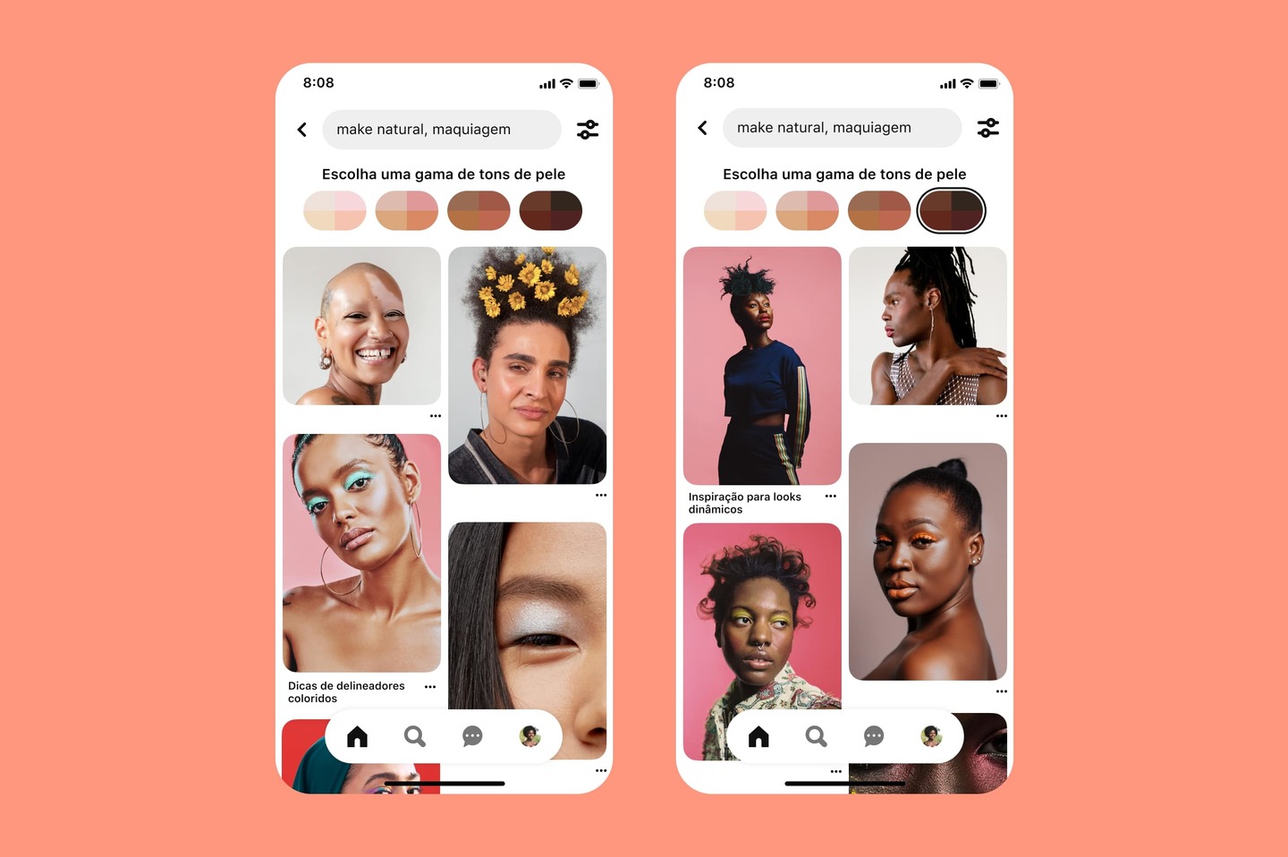 Pinterest/DivulgaçãoOutra mudança foi na barra de pesquisa, que passou a oferecer resultados de beleza mais inclusivos. Isso quer dizer que, quando você pesquisa por cabelo cacheado, por exemplo, a plataforma oferece uma gama de tons de pele que permite que redefinir a pesquisa para resultados mais semelhantes com seus interesses.