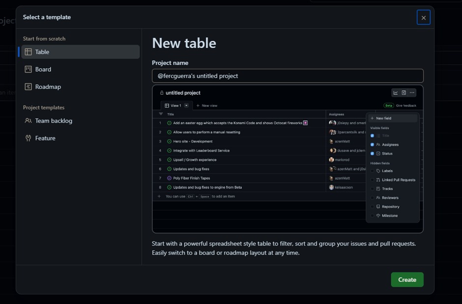 Figura 2 - Criando um board no Github Projects