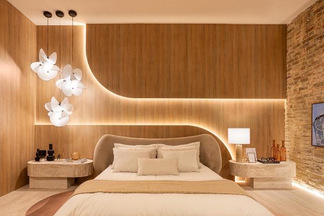 Com o tema deste ano "De presente, o agora", Calabria pensou em cada detalhe na hora de compor o espaço. Em um quarto espaçoso para circulação, proporcionando fluidez e aconchego, a proposta é a desconexão das telas para conexão maior do casal.
