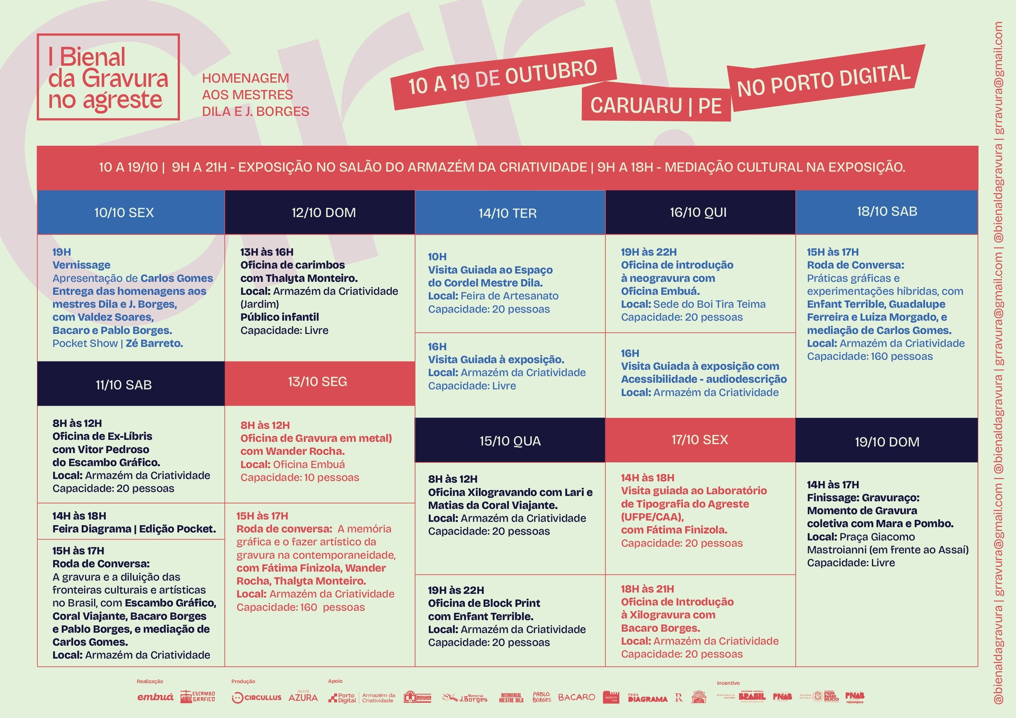 15h às 17h – Roda de conversa: A gravura e a diluição das fronteiras culturais e artísticas no Brasil. Palestrantes: Escambo Gráfico, Coral Viajante (Recife-PE), Bacaro Borges e Pablo Borges (Bezerros-PE). Mediação: Carlos Gomes (Caruaru-PE). Local: Armazém da Criatividade.