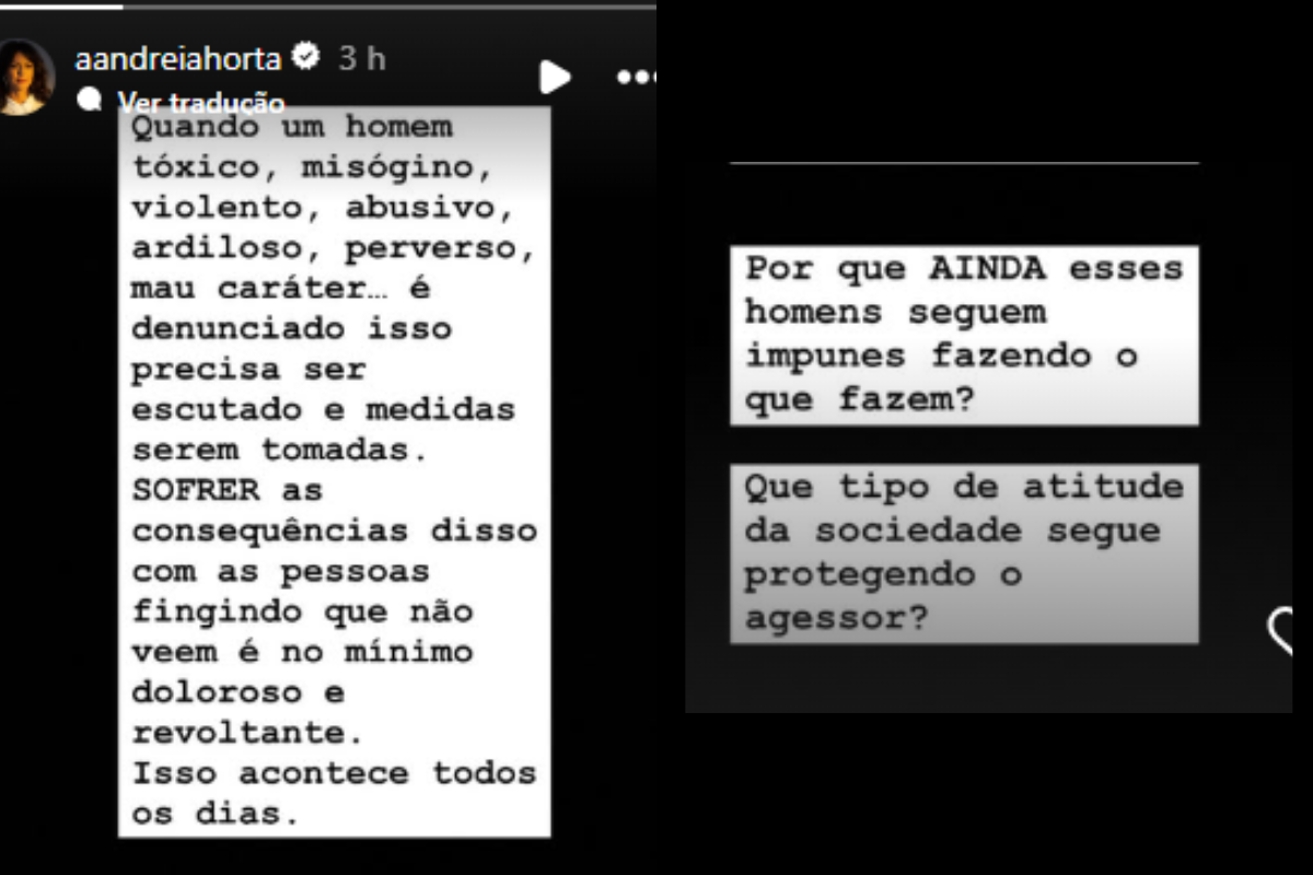 “Quando um homem tóxico, misógino, violento, abusivo, ardiloso, perverso, mau caráter… é denunciado, isso precisa ser escutado e medidas serem tomadas. Sofrer as consequências disso com as pessoas fingindo que não veem é no mínimo doloroso e revoltante. Isso acontece todos os dias” escreveu Andréia nos Stories.
