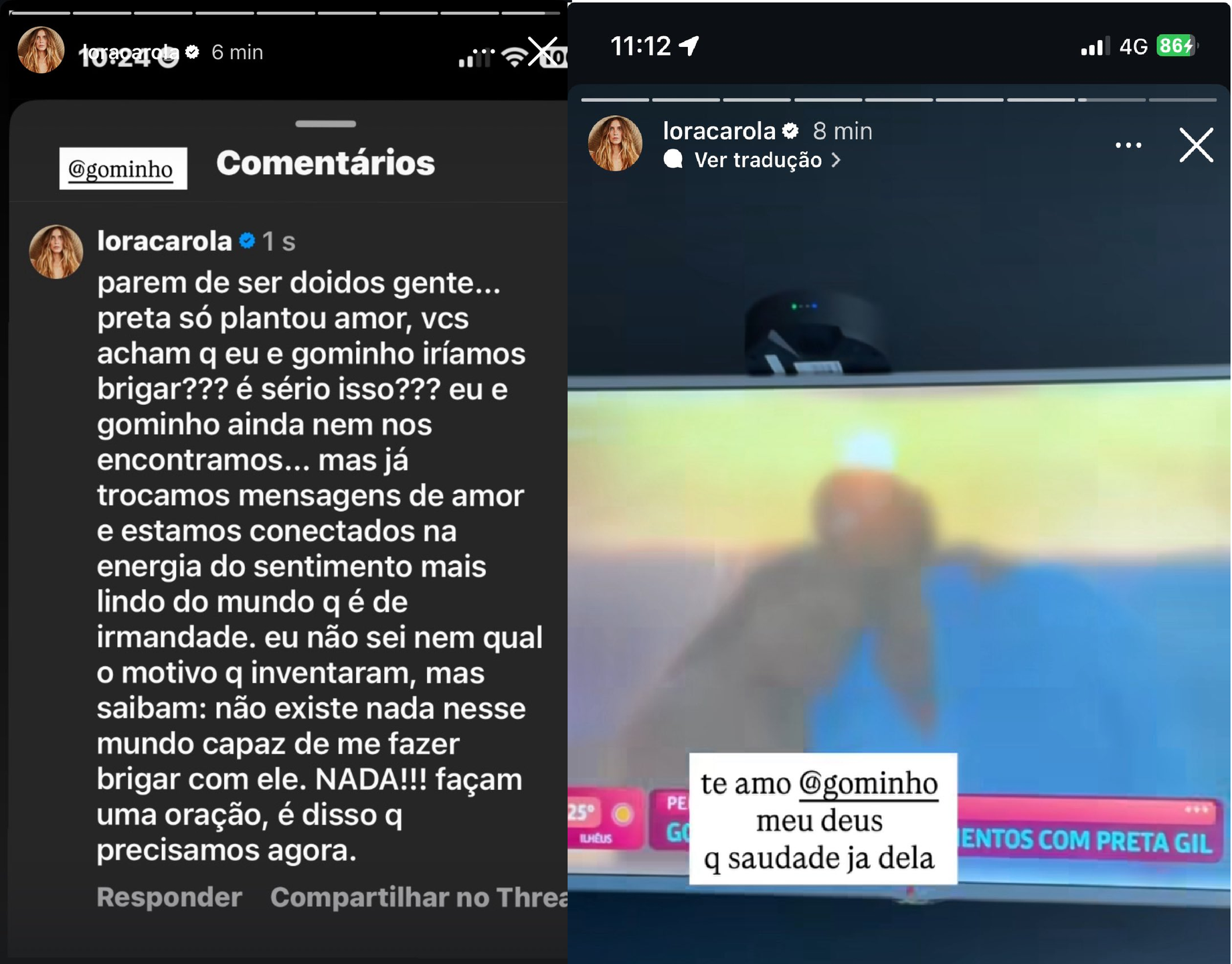 A atriz publicou um comentário nas redes sociais na manhã desta sexta-feira (25) e, em seguida, compartilhou o texto nos stories do Instagram, marcando Gominho. "Parem de ser doidos gente... Preta só plantou amor, vocês acham que eu e Gominho iríamos brigar, é sério isso?", escreveu.