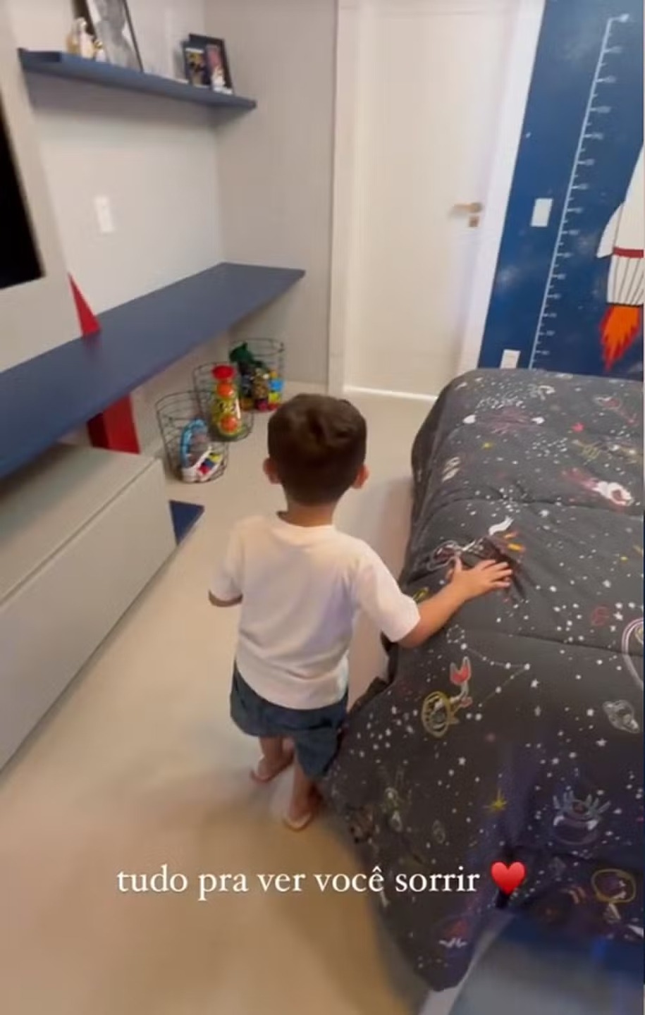 Filho de Marília Mendonça e Murilo Huff, Léo conhece o seu quarto na casa do pai — Foto: Reprodução“Eu adorei”, exclamou na época Léo, que não esconde sua predileção pela temática espacial. No vídeo compartilhado pelo pai, ele sabia o nome de todos os planetas.