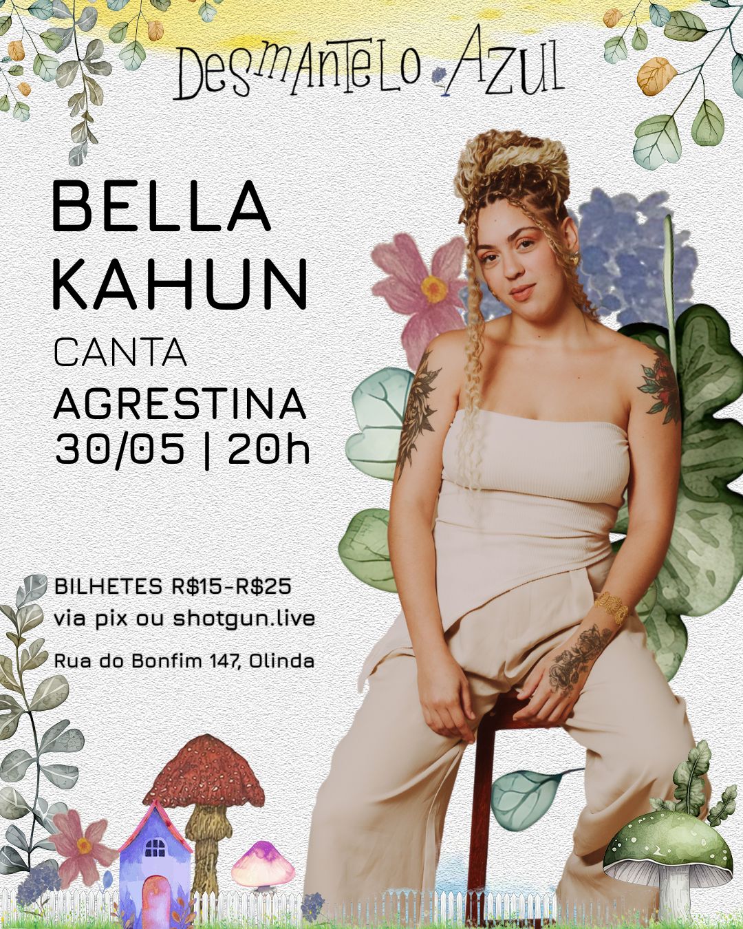 O espaço cultural Desmantelo Azul inaugura sua programação musical nesta sexta-feira (30), às 19h, no número 147 da Rua do Bonfim, Sítio Histórico de Olinda, com apresentações do DJ Caio Lavor e da cantora e compositora Bella Kahun, natural de Garanhuns. Os ingressos custam R$20 e estão à venda na plataforma Shotgun.live e no local.