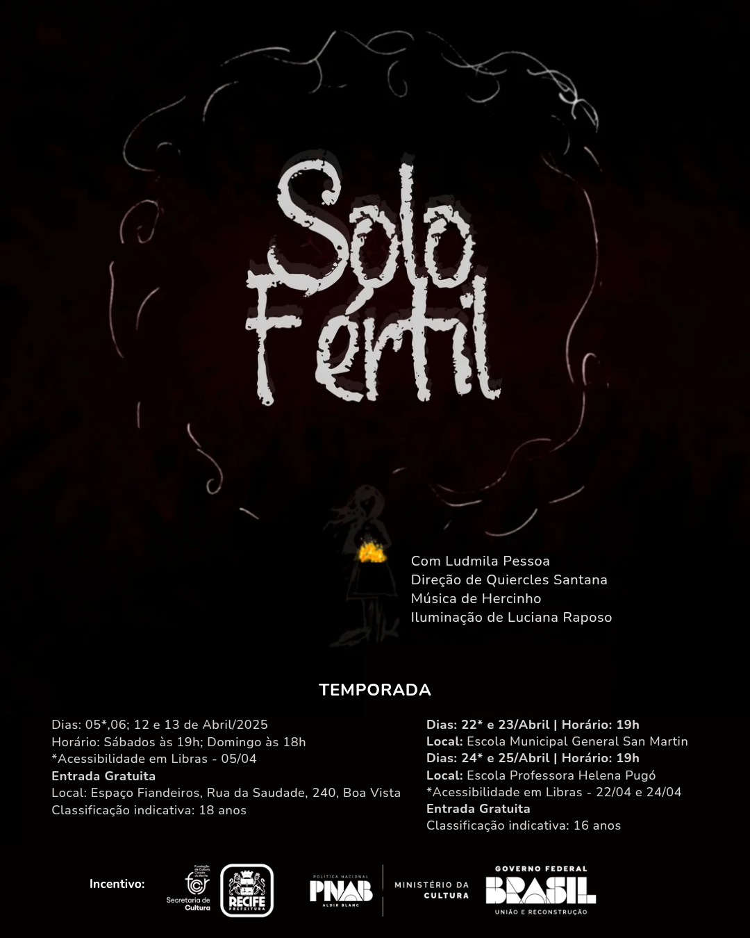 Combinando histórias de mulheres e textos indígenas para criar um teatro sagrado, ritual, político e poético que amplia a voz de grupos marginalizados, Solo Fértil tem trilha sonora original, composta e executada, ao vivo, pelo músico Hercinho Gouveia.