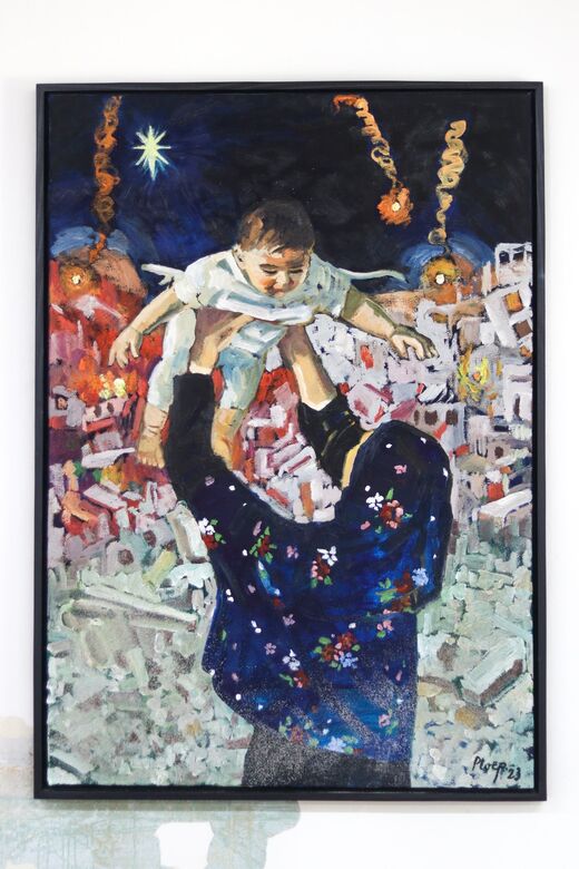 “Algumas pinturas ficaram próximas à comemoração dos 800 anos do presépio e à figura de São Francisco, com ele presente na tela, ou tendo a imagem do Convento no cenário”, aponta. Outras obras buscam representar a repercussão violenta dos conflitos entre Israel e o Hamas, que já levou à morte de milhares de pessoas.