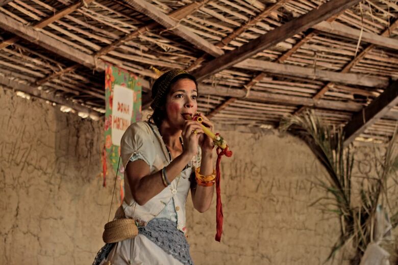 Na apresentação, Kika Farias interpreta Dona Mocinha - personagem que é um misto de andarilha, palhaça e griô. Ela conta histórias populares com seu espírito brincante, cativando crianças e adultos.