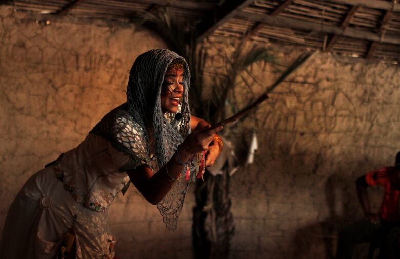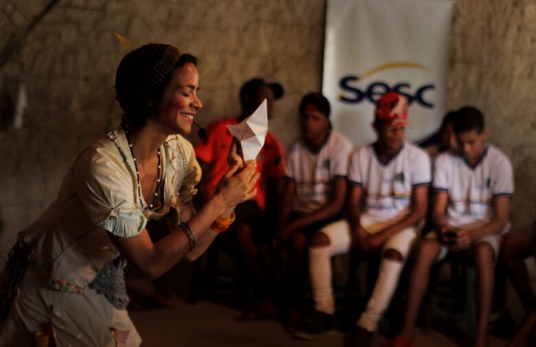 A personagem Dona Mocinha em cada canto que chega convida o público para uma roda e entrelaça poéticas da vida e saberes populares em histórias emocionantes.
