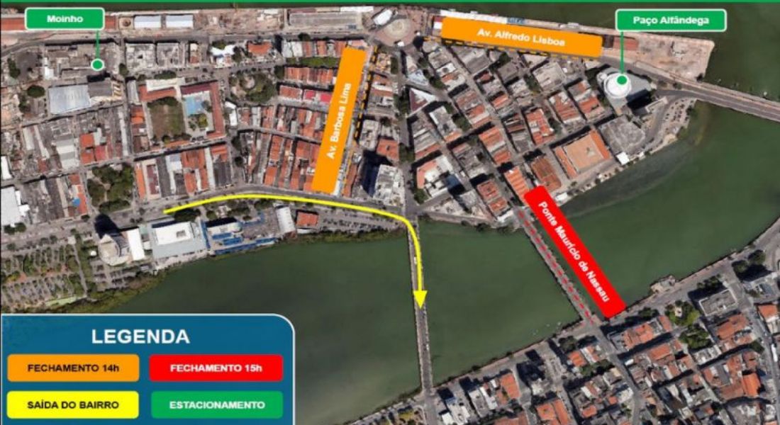 As pontes Maurício de Nassau e Buarque de Macedo fecham às 15h. A Buarque de Macedo, no entanto, fica liberada apenas para a circulação de ônibus.