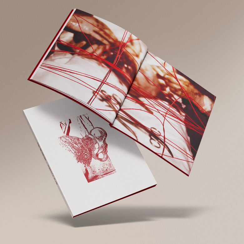 O fotolivro dialoga com as imagens, em um formato compacto de 12x17 cm, convidadivo ao manuseio e à imersão. A paleta de cores, inspirada no sangue, simboliza a fluidez e a transformação, do sangue vivo ao coagulado, criando uma conexão orgânica com o tema.