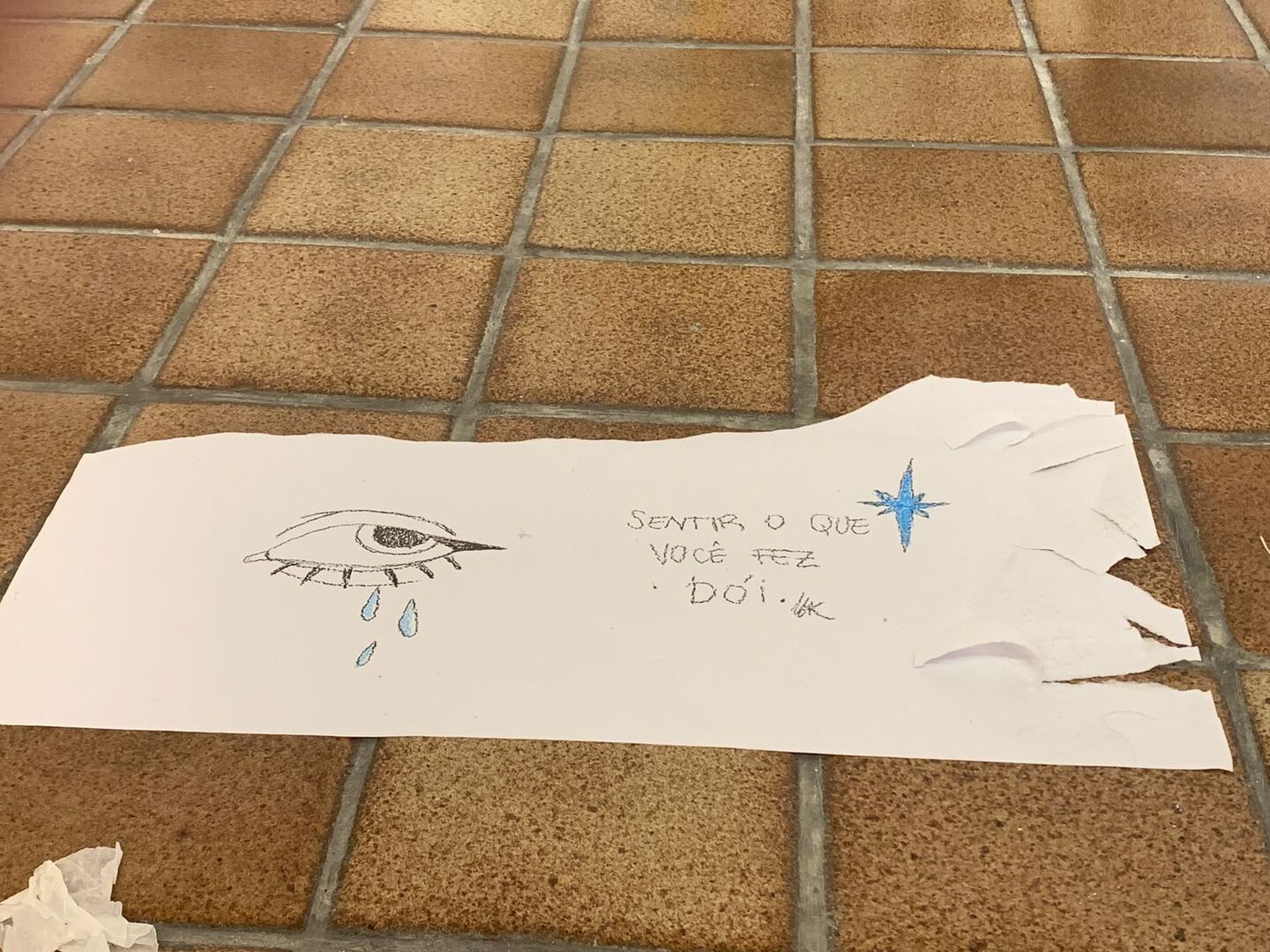 “A partir disso, comecei a fazer esses convites para que as pessoas pudessem deixar coisas. Veio um grupo da Traços Terapia e foi incrível. As pessoas abordaram a questão dos traumas com o rasgos. Então, a medida que falavam, iam rasgando que é um gesto que traz isso”, lembra. Uma dessas pessoas deixou na exposição uma frase escrita em um papel: “Sentir o que você fez dói”, que passou a compor a instalação.