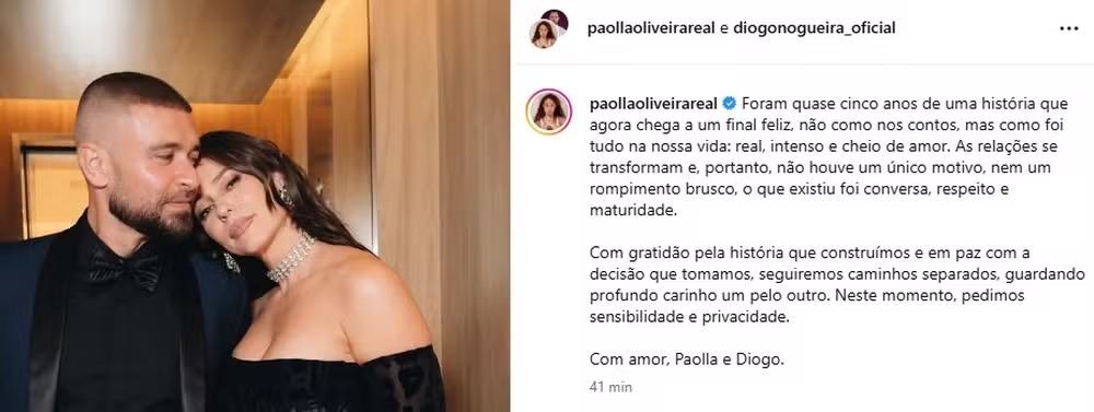"Foram quase cinco anos de uma história que agora chega a um final feliz, não como nos contos, mas como foi tudo na nossa vida: real, intenso e cheio de amor. As relações se transformam e, portanto, não houve um único motivo, nem um rompimento brusco, o que existiu foi conversa, respeito e maturidade. Com gratidão pela história que construímos e em paz com a decisão que tomamos, seguiremos caminhos separados, guardando profundo carinho um pelo outro. Neste momento, pedimos sensibilidade e privacidade", escreveram em uma postagem compartilhada nos perfis dos dois na rede.