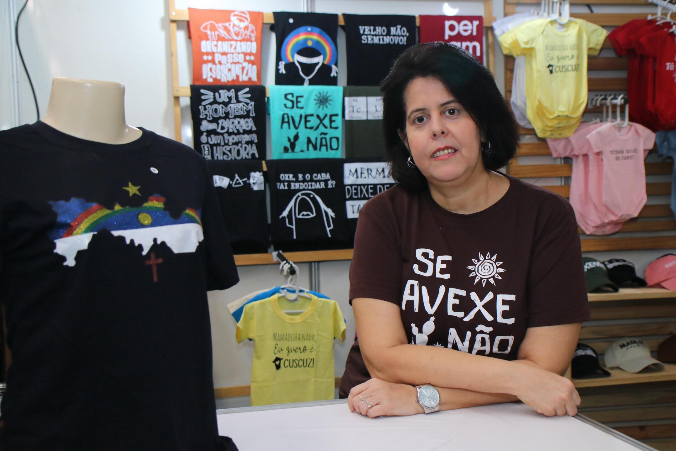 Idealizadora da Marminino, Janaina Ferreira. Foto: Arthur Mota/Folha de Pernambuco“Nos outros anos, a gente vendeu bem. Vem muita gente do interior. E como as frases da gente são bem nordestinas, tem essa pegada bem raiz, sempre é sucesso. As camisas unissex saem mais, com gírias, músicas nordestinas, e expressões. Tudo que envolve o Nordeste, Pernambuco, a gente coloca em camisa”, explicou.