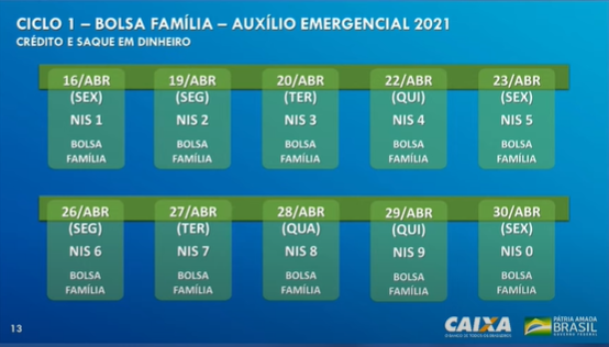 Já os beneficiários do Bolsa Família receberão o auxílio no calendário habitual de pagamentos, pelo número final do NIS. As pessoas só recebem o benefício emergencial se o valor for superior ao que recebem no Bolsa Família. Os pagamentos são feitos sempre nos dez últimos dias úteis do mês. Este primeiro ciclo tem início no dia 16 de abril e vai até o dia 30 do mesmo mês.