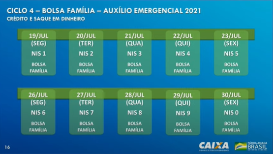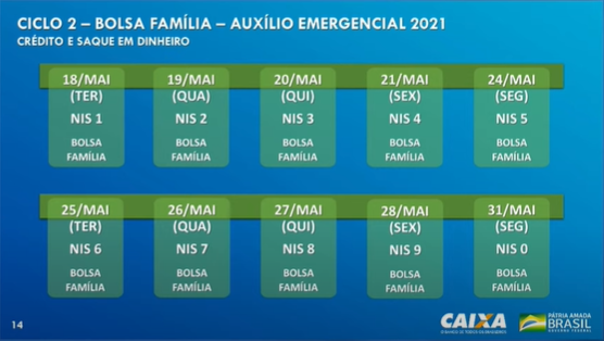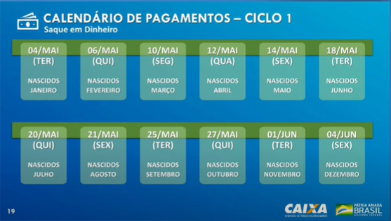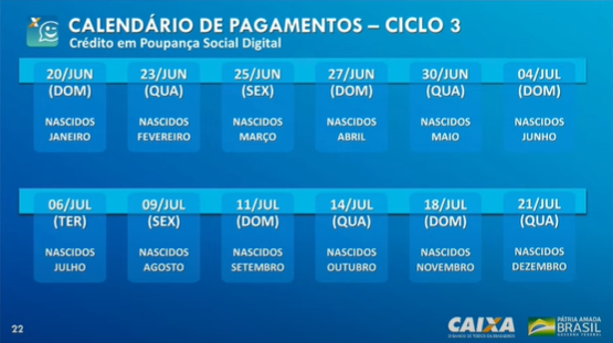 Crédito: Reprodução/YoutubeO segundo ciclo tem início o dia 16 de maio e termina em 16 de junho. O ciclo três começa no dia 20 de junho e vai até o 21 de julho e último ciclo será pago a partir do dia 23 de julho e se encerra no dia 22 de agosto [confira o calendário completo no final da matéria].