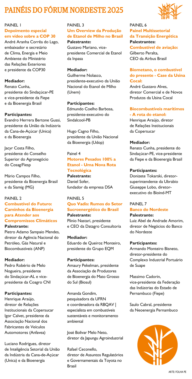 Na solenidade de abertura, às 9h, será entregue o Prêmio Fórum Nordeste. O primeiro painel, às 10h15, contará com um depoimento em vídeo do embaixador e secretário de Clima, Energia e Meio Ambiente do Ministério das Relações Exteriores, André Aranha Corrêa do Lago, sobre a 30ª Confederação das Nações Unidas sobre as Mudanças Climáticas (COP30), da qual é presidente. A mediação será do presidente do Sindaçúcar-PE, Renato Cunha.