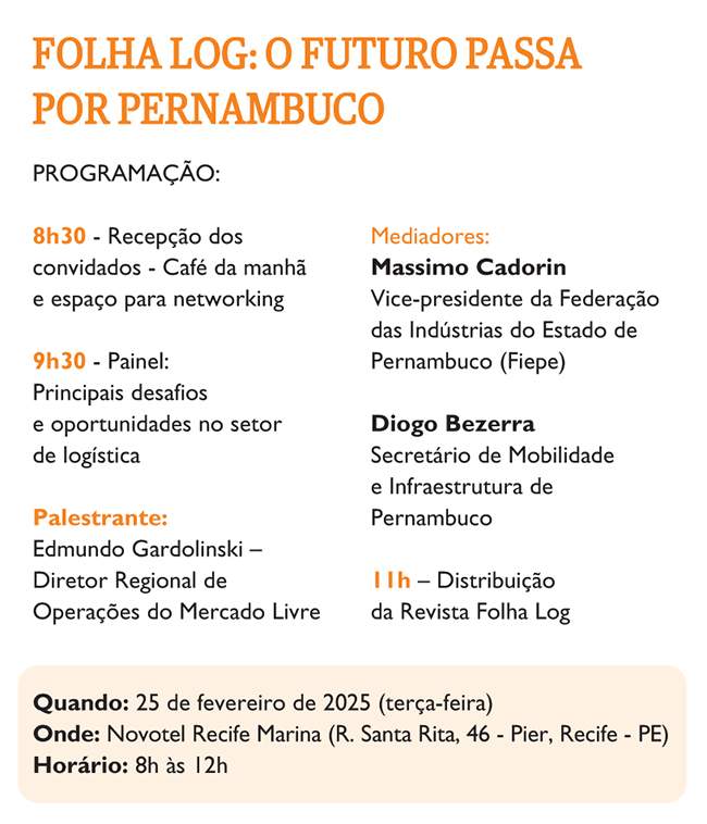 Diante desse cenário promissor, a Folha de Pernambuco realizará, nesta terça-feira, o Folha Log – O Futuro Passa por Pernambuco, o primeiro evento de logística promovido pelo jornal. Com essa iniciativa, busca-se debater os desafios e oportunidades do setor, reunindo especialistas, empresários e representantes de grandes empresas para discutir o desenvolvimento logístico local.