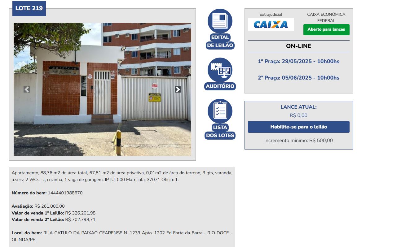 Um dos imóveis ofertados é um apartamento no bairro de Rio Doce, em Olinda, com lance inicial de R$ 326 mil | Foto: Fidalgo Leilões/ReproduçãoInteressados devem preencher com antecedência os dados solicitados, bem como anexar a documentação exigida.