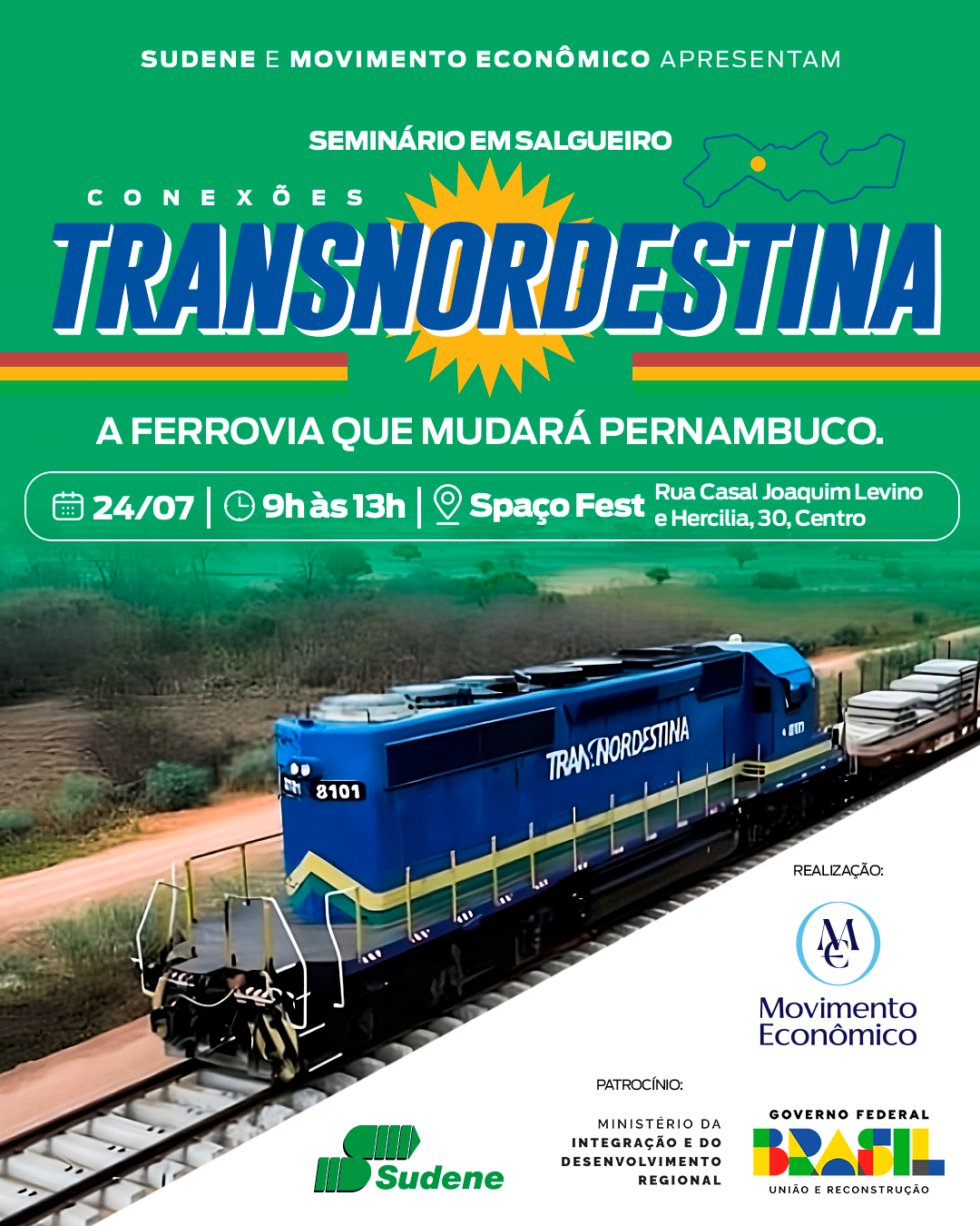 Tem início no próximo dia 24 de julho, em Salgueiro (PE), a série de seminários Conexões Transnordestina A Ferrovia que Move Pernambuco, realização do Movimento Econômico com patrocínio da Sudene. O evento inaugural acontece das 9h às 13h, no Espaço Fest, com abertura do superintendente Danilo Cabral. A iniciativa visa debater os impactos econômicos e logísticos do ramal SalgueiroSuape, apontado como um dos principais vetores de transformação regional.