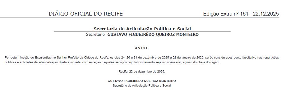Determinação saiu em edição extra do Diário Oficial do Recife | Foto: Diário Oficial do Recife/ReproduçãoA medida da capital pernambucana é similar ao decreto anunciado pelo governo do estado no último sábado (20). Nas repartições estaduais, também haverá pontos facultativos nos dias que antecedem e sucedem o Natal e o Ano-Novo.