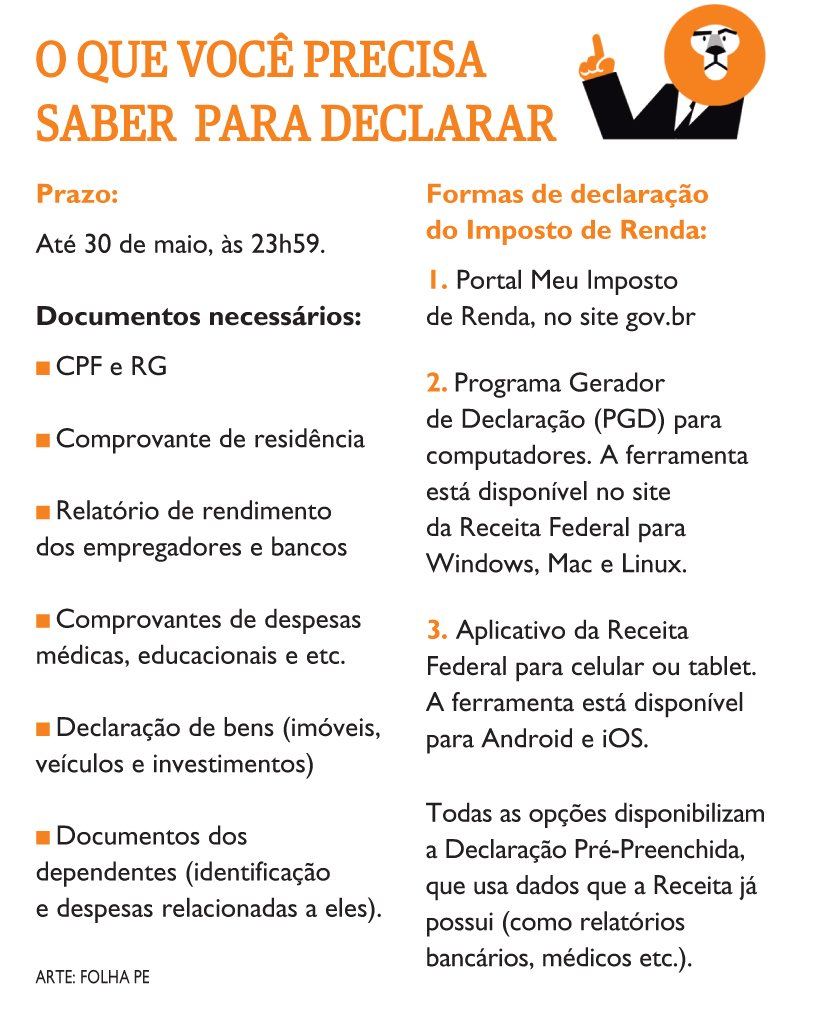 Para realizar a declaração no prazo, o cidadão deve estar munido de uma série de documentações, incluindo CPF e RG; comprovante de residência; informe de rendimentos do empregador e bancos; e comprovantes de despesas que podem ser deduzidas, como educação e saúde.