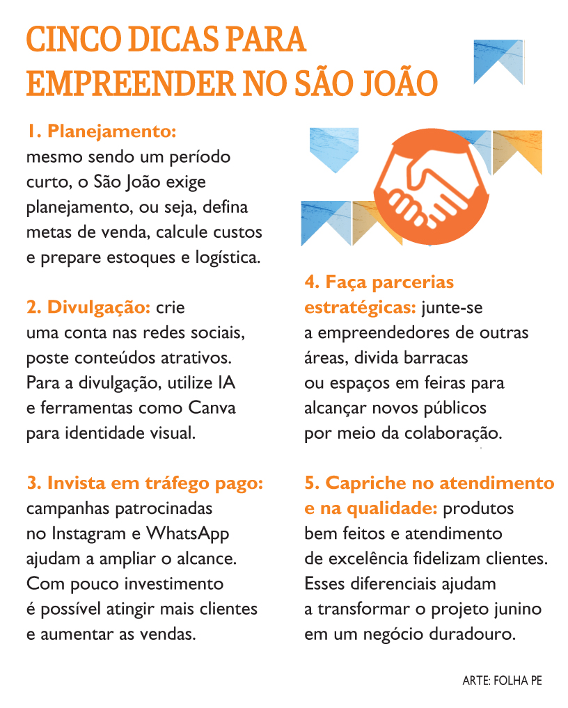 Os festejos juninos no Nordeste é o período do ano que mais movimenta negócios informais, potencializando a renda dos empreendedores que apostam nas festas. No centro do Recife, por exemplo, a cultura junina toma conta da metrópole e cria oportunidades para geração de renda. Para empreendedores que trabalham nos polos do Recife e os que atuam com venda de itens sob encomenda, a expectativa é de um ciclo junino aquecido e promissor para a economia local.