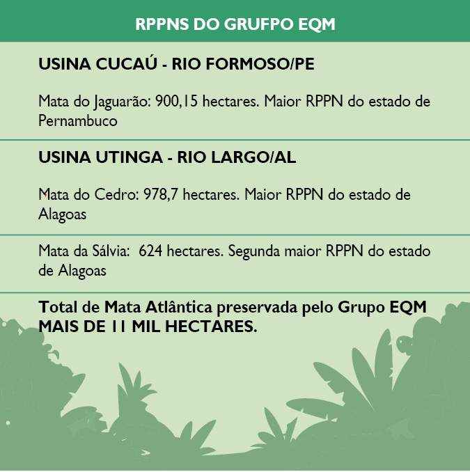 Na Usina Cucaú, em Rio Formoso, Litoral Sul de Pernambuco, que está completando 134 anos de atividades, a RPPN Mata do Jaguarão preserva 900,15 hectares de Floresta Atlântica. Já na Usina Utinga, fundada há 131 anos, no município de Rio Largo, em Alagoas, as RPPNs Mata do Cedro e Mata da Sálvia têm, respectivamente, 978,7 hectares e 624 hectares.