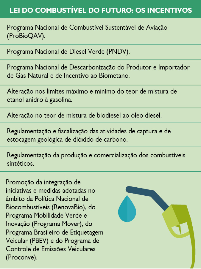 A lei criou, ainda, o Programa Nacional de Descarbonização do Produtor e Importador de Gás Natural e de Incentivo ao Biometano, para estimular a pesquisa, a produção, a comercialização e o uso do biometano e do biogás na matriz energética brasileira. Quanto ao Programa Nacional do Diesel Verde (PNDV), o CNPE fixa, a cada ano, a quantidade mínima de diesel verde que será adicionado ao diesel vendido ao consumidor final.