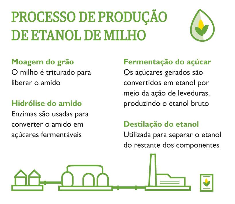O processo de produção do etanol de milho envolve etapas bem definidas: inicialmente, ocorre a moagem do grão, triturando o milho para liberar o amido. Em seguida, o amido passa por hidrólise, onde enzimas o transformam em açúcares fermentáveis. Esses açúcares são então convertidos em etanol por leveduras durante a fermentação, e, por fim, a destilação separa o etanol do restante dos componentes, garantindo a obtenção do produto final.
