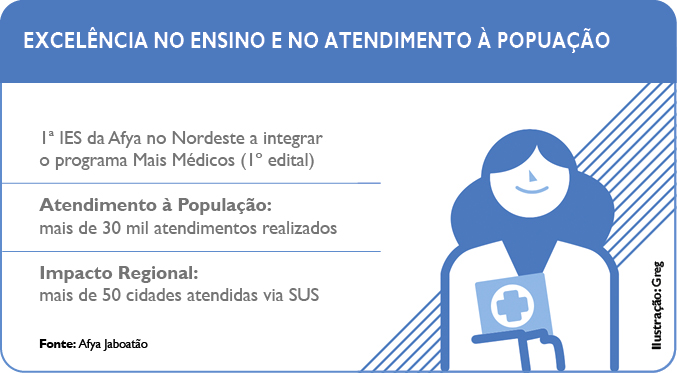 A Afya Jaboatão alinha o ensino inovador ao impacto social direto na comunidade. A instituição já opera um Ambulatório Especializado de Ensino e Serviço (AEES), que foi inaugurado no início de 2024. Oferecendo 16 especialidades, o ambulatório aproxima os estudantes da realidade do Sistema Único de Saúde (SUS) e garante à população acesso a serviços de saúde gratuitos.